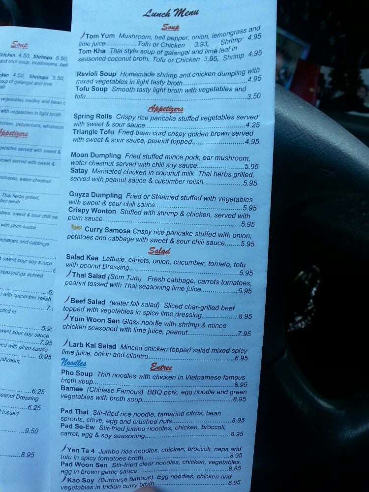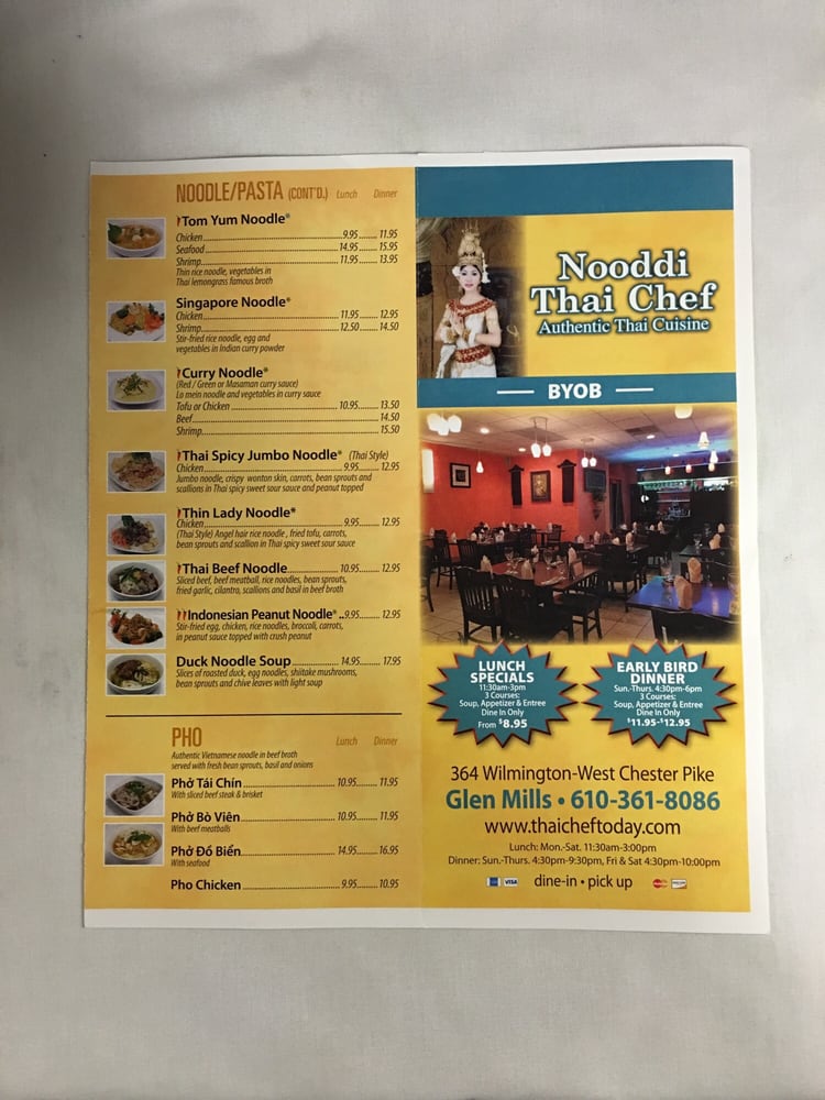 Introducing the menu at Nooddi Thai Chef, a hidden gem in Glen Mills, PA, offering a variety of Thai dishes with vegan and vegetarian options. The restaurant provides a quiet and intimate atmosphere, perfect for lunch or dinner with options for takeout, delivery, and reservations. Customers rave about the delicious Pad Thai, Tom Kha soup, Khao Soi, and red Thai curry. The menu also includes a variety of appetizers like shrimp dumplings, spring rolls, and crab Rangoon. The service is excellent, with friendly staff and quick service. Overall, Nooddi Thai Chef is a warm and cozy yet modern restaurant that impresses with its authentic Thai flavors and reasonable prices. Don't hesitate to try it and experience the fantastic food and ambiance for yourself.